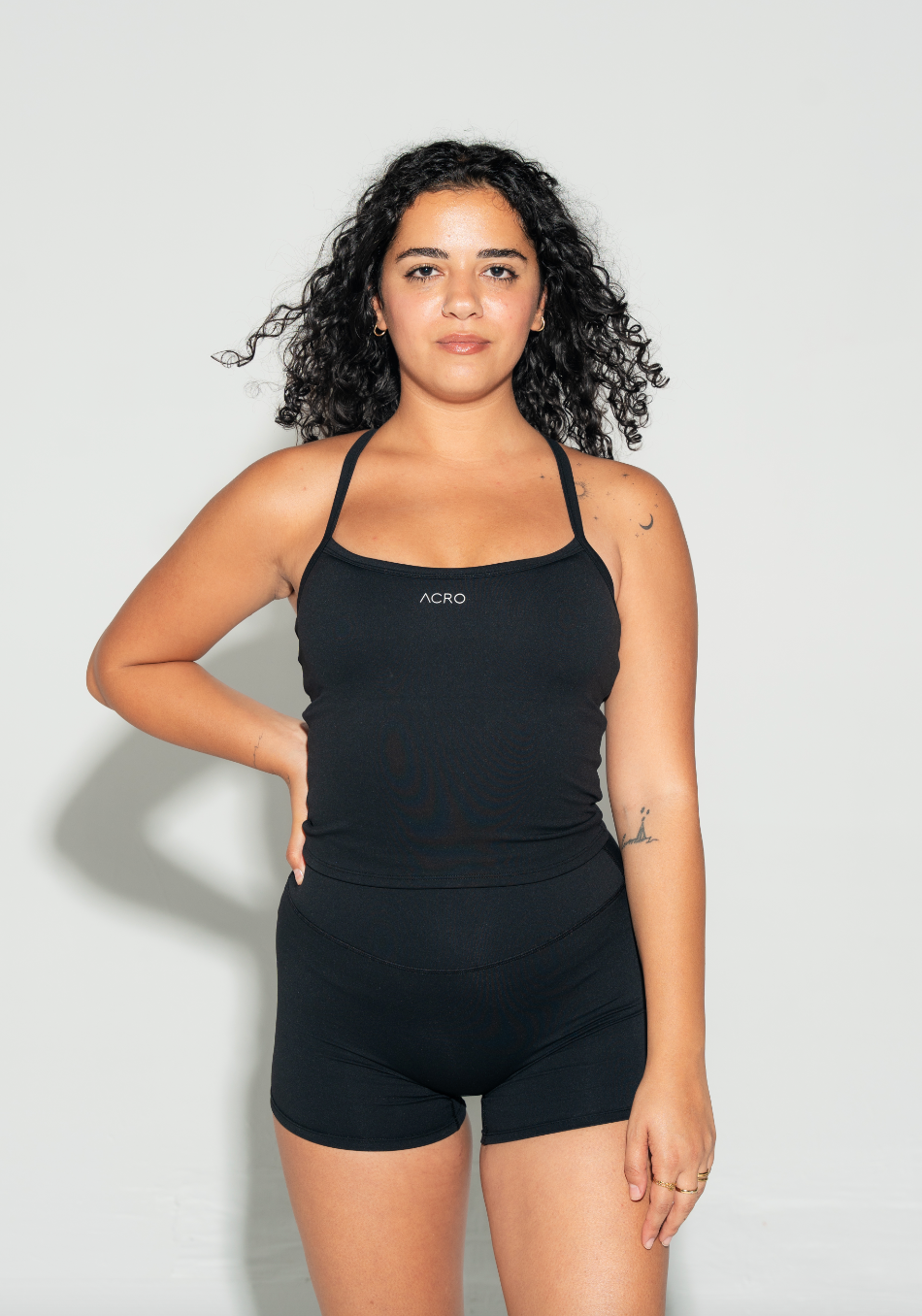 - Two-piece tank top with removable pads and bum sculpting shorts