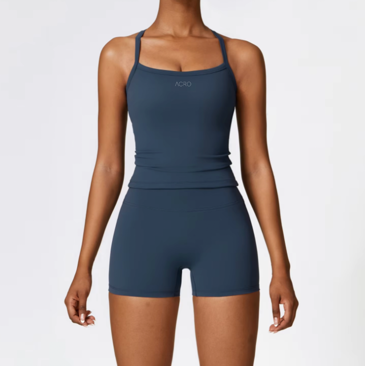 - Two-piece tank top with removable pads and bum sculpting shorts